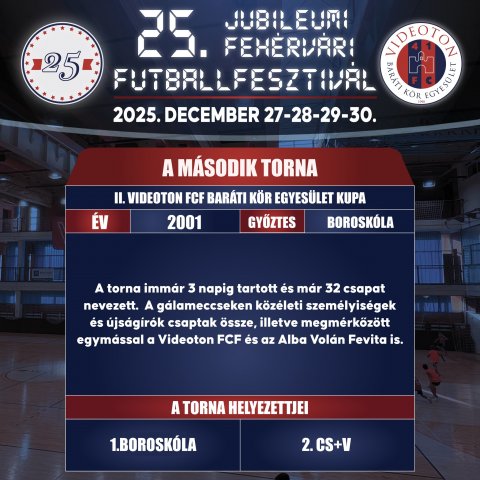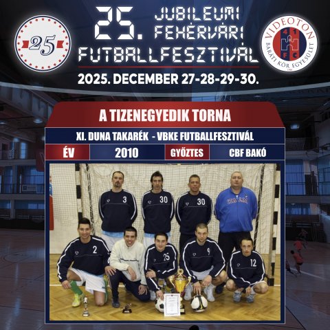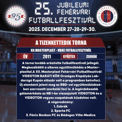 Először nevezhetjük igazán futballfesztiválnak a 3 napos rendezvényt. A IX. Duna Takarék - Videoton Baráti Kör Futball Fesztivál a Mad Dogs győzelmével zárult. A Sport and Media kupában az FC Fehérvár, a BFC-Siófok és a Lombard FC Pápa NB I-es játékosai mutathatták meg, hogy nem jönnek zavarba a kispályán sem. A nagyszerű összecsapások végén Fehérváron maradt a kupa. Az év különlegessége a Videoton '89- Magyar Válogatott '89 mérkőzés volt, ahol a piros-kékeknél Mezey György és Németh János irányítása mellett a Petry, Jován, Petres, László, Németh, Csucsánszky, id. Horváth Gábor, Király, Babai, Czigány, Sipos, Quiriko, Jónás fémjelezte csapat nézett farkasszemet a Bicskei Bertalan vezette Disztl Péter, Bognár, Keller, Vincze, Cseh, Wukovics alkotta válogatottal. ![]() 2009 – X. Duna Takarék - VBKE Futballfesztivál A X. Duna Takarék - Videoton Baráti Kör Egyesület Futballfesztiválon a döntőben büntetőkkel bizonyult jobbnak a Mad Dogs csapata a Főnix FC Bon-Bon alakulatánál. A harmadik helyért: Bádogos-Alba Complett - Villanegra (4-2) összecsapást rendeztek. A fesztivál ideje alatt összemérték erejüket a Videoton Labdarúgó Közalapítvány, a Főnix Gold FC és a Dunafém-Maroshegy U-10-es gyermekcsapatai és megrendezték a Botos István Vándorkupát, melyért első ízben a Videoton U-18 a Tatabánya U-18 csapatával játszott. Újra bővült a gálamérkőzések kínálata. A Parlament SE csapata a fehérvári közéleti válogatottal játszott. A kupák történetében először női focibemutató volt a fehérvári ARISZ és a Sárszentágota csapatai között. Egy háromcsapatos mini focitornát is rendeztünk a Videoton FC, a Lombard FC Pápa és a Tatabánya csapatai között. A torna az 1985-ös UEFA kupadöntős Videoton és az akkori Partizan Belgrád gálamérkőzésével zárult. ![]() 2010 - XI. Duna Takarék - VBKE Futballfesztivál A XI. Duna Takarékszövetkezet VBKE futballfesztivál megrendezése csőtörés miatt veszélybe került és ennek ellenére is, négynapossá bővült a rendezvény. Gálamérkőzéseken először a Videoton Labdarúgó Közalapítvány és a Dunafém-Maroshegy U10-es csapatai játszottak egymással, majd a Mezővári József emlékmérkőzésen pedig a Dunafém-Maroshegy játékosai léptek parkettre. Takács Lajos emlékére is volt gálamérkőzés, amelyen a régi vidis csapattársak, barátok és Lali fiai játszottak. A Botos István vándorkupáért a Videoton FC és a Siófok U18-as csapatai vetélkedtek. Ebben az évben Székesfehérvár közéleti válogatottja csapott össze az NB I-es női futsalbajnok Vesta Persecutor K és 3S csapatával. A döntőt a Villanegra csapata vívta a CBF Bakó gárdájával. A torna győztese a CBF Bakó lett (3-1-es győzelemmel) ![]() 2011– XII.MASTERPLAST - VBKE Futballfesztivál A torna tovább erősítette futballfesztivál jellegét. Megkezdődött a sikeres együttműködés a Masterplasttal. A XII. Masterplast Fehérvári Futballfesztivál VIDEOTON BARÁTI KÖR Országos Kispályás Labdarúgó Kupán először volt a programban ketrecfoci. Új elemként jelent meg az RBD-vel együttműködésében szervezett szurkolói foci is. A legérdekesebb gálamérkőzés az NB I-be visszajutott VIDEOTON és a VIDEOTON vegyes csapatának küzdelme volt. A tornát a Zebrák csapata nyerte! ![]() 2012 - XIII.MASTERPLAST FEHÉRVÁRI FUTBALLFESZTIVÁL XIII. Masterplast VIDEOTON BARÁTI KÖR Országos Kispályás Labdarúgó Kupán hosszú idő után született ismét „hazai” győzelem, miután a Fehérvár Futsal nagyon izgalmas döntőben múlta felül a címvédő Zebrák csapatát. Tovább erősödött a női vonal, hiszen a Veszprém NB2-es női nagypályás labdarúgó csapata a székesfehérvári ARISZ-szal játszott. ![]() 2013 – XIV. Masterplast Fehérvári Futballfesztivál A XIV. VIDEOTON BARÁTI KÖR Nemzetközi Kispályás Labdarúgó Kupa és Családi Sport- és Egészségnapok keretein belül ismét számos program közül választhattak az érdeklődők. Az újdonság, hogy szélesedett a résztvevő külhoni csapatok köre. Vendégünk volt a Play-Mates (Dunaszerdahely), Szentegyházi Vasas Sportklub, Opole, Marcelháza, Zára, Szabadka. A gálamérkőzés ezúttal játékvezetőkkel és a Videoton, Puskás Akadémia, Felcsút csapatainak edzőivel, játékosaival és közéleti szereplőkkel zajlott. A mérkőzés szünetében rendezett hetesrúgó versenyt Bíró Enikő nyerte a Székelyudvarhelyi Vasas Femina csapatából. A döntőben a Zebrák a Csövesek elleni 2:0-s győzelemmel visszahódították a serleget. ![]() 2014 – XV. Masterplast Fehérvári Futballfesztivál XV. MASTERPLAST Fehérvári Futballfesztivál VIDEOTON FCF BARÁTI KÖR Nemzetközi Kispályás Labdarúgó Kupa legnagyobb attrakciója az legendás UEFA-menetelés 30. évfordulójára emlékező, Videoton SC 84' - Partizan Belgrád & FK Zeljeznicar 84' összecsapás volt. A Vidi egykori krónikása, Botos István emlékére kiírt kupa a Videoton U18-as csapatáé lett, akik a klub U 17-es együttesét győzték le. A torna végeredménye: 1. WORKER-Line Villanegra 2. Fehérvár Futsal-Dávid Kiss Kft 3. Döcös ![]() 2015 – XVI. Masterplast Fehérvári Futballfesztivál XVI. MASTERPLAST Fehérvári Futballfesztivál VIDEOTON FCF BARÁTI KÖR Nemzetközi Kispályás Labdarúgó Kupa győztese a Karmacsi Autó csapata lett, miután a döntőben a Villanegra csapatát győzte le 1-0 arányban! 2016 – XVII. Masterplast Fehérvári Futballfesztivál A XVII. MASTERPLAST Fehérvári Futballfesztivál VIDEOTON FCF Baráti Kör Nemzetközi Kispályás Labdarúgó Kupára már a torna főszervezőjének, Juhász Lászlónak a tervei szerint minden irányból érkeztek külhoni csapatok. Az Imperial Wet csapata Székesfehérvár székelyföldi testvérvárosából, Csíkszeredából, a Szentegyházi Vasas és Székelyudvarhe