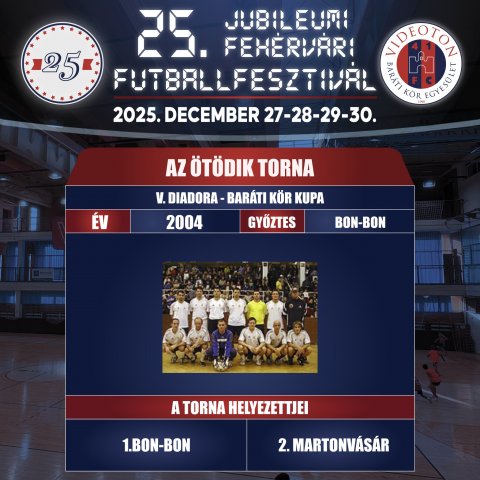 ![]() 2003 – A negyedik VBKE Diadora Kupa! A negyedik tornán a Club Feca szerezte meg a győzelmet, miután a döntőben felülmúlta a Videoton Baráti Kör csapatát. ![]() 2004 – V. Diadora - Baráti Kör Kupa Először ér el kimagasló eredményt külhoni csapat, mivel a bronzmérkőzésen a Szabadka csapata 3–1 arányban győzött, így megszerezték a torna harmadik helyét. A mindent eldöntő összecsapáson a Bon-bon együttese döntetlenre végzett a Martonvásárral szemben, azonban a büntetőpárbajban sikeresebbnek bizonyult ellenfelénél, így ők vehették át az OPEL–Szuna Kft által felajánlott kupát, illetve a Diadora sportszereléseket. A Baráti Kör Kupa zárómérkőzése az 1984-es UEFA kupa menetelés Videoton - Partizan Beograd összecsapásának visszavágója volt. A belgrádi csapat és a hazai együttes tiszteletére délelőtt a Városházán volt fogadás, majd egy közös ebédet követően Májer Lajos sírjára helyeztek el egy piros-kék színű csokrot. Ezután a Stadion bemutatása következett, majd megérkeztek a Videoton Oktatási Központba, ahol már több ezer szurkoló várta őket. A két csapat találkozója előtt Végvári László elénekelte a Májer emlékdalt, amelynek hallgatása közben bizony több szurkoló sem tudta visszatartani könnyeit. A mérkőzés pedig maga volt a csoda, s nem a 4–4-es végeredmény számított, hanem az, hogy itt volt Disztl László, Disztl Péter,Csuhay József, Végh Tibor, Horváth Gábor, Burcsa Győző, Szabó József, Vaszil Gyula, Gyenti, Gömöri Ottó, Vadász Imre, Borsányi István, Csongrádi Ferenc, Wittman Géza, Koszta János és edzőik, Kovács Ferenc és Hartyáni Gábor is. Képek és Galériák ![]() 2005 – VI. DIADORA-Videoton Baráti Kör Kupa A végső győzelmet a RONEKO gárdája szerezte meg, miután a döntőben diadalmaskodott a veszprémi Play Caffe ellenében. A bronzérmet a Bon-Bon Fehérvár Beton vihette haza, a negyedik pedig a Pados 2001 Kft. csapata lett. A gálamérkőzéseken Orbán Flóriánt, Dajka Lászlót, Zoran Kunticsot, Kiprich Józsefet, a Disztl testvéreket, Csató Sándort, Csucsánszky Zoltánt, Tőkés Lászlót, a média szereplői közül Léderer Ákost, Szántó Dávidot, valamint a székesfehérvári egyesületek részéről az Albacomp, az Alba-Volán Fevita a MÁV Előre és az FC Fehérvár játékosait láthattuk. Megmutatták labdarúgó tudásukat a női játékvezetők és a magyar ügyvédválogatott tagjai. ![]() 2006 – VII. Videoton Baráti Kör - Kuti Sport- Puma labdarúgó torna VII. Videoton Baráti Kör - Kuti Sport-PUMA Kispályás Labdarúgó Torna elődöntőjébe a Bádogos, a Carissa Virág, a CBF Bakó és a Bon Bon jutott. Az elődöntőkből aztán a Bádogos és a Bon Bon került a döntőbe, ahol nagyszerű játékkal az utóbbi csapat diadalmaskodott. Különleges mérkőzésnek is színtere volt a kupa. A 2012-es EB-rendezés jegyében lebonyolított mérkőzésen a horvát Csáktornya 7:3 arányban győzött az FC Fehérvár ellenében, így ők vihették haza a SportLife Média Kft kupáját. 2007 –VIII. Turul-Macron - Videoton Baráti Kör kispályás labdarúgó torna A VIII. Turul-Macron-Videoton Baráti Kör Országos Kispályás Labdarúgó Tornán a bronzmeccset a Lászlóvill-Villanegra a Heroes csapatával, míg a döntőt a Bon-Bon a Bádogos-MaxEurope együttesével vívta. A kisdöntőt a Lászlóvill-Villanegra nyerte. A döntőben Bon-Bon-t legyőzve a torna történetében első alkalommal a Bádogos-MaxEurope emelhette fel a serleget." ![]() 2008- IX. Dunatakarék-Videoton Baráti Kör Országos Kispályás Labdarúgó Torna